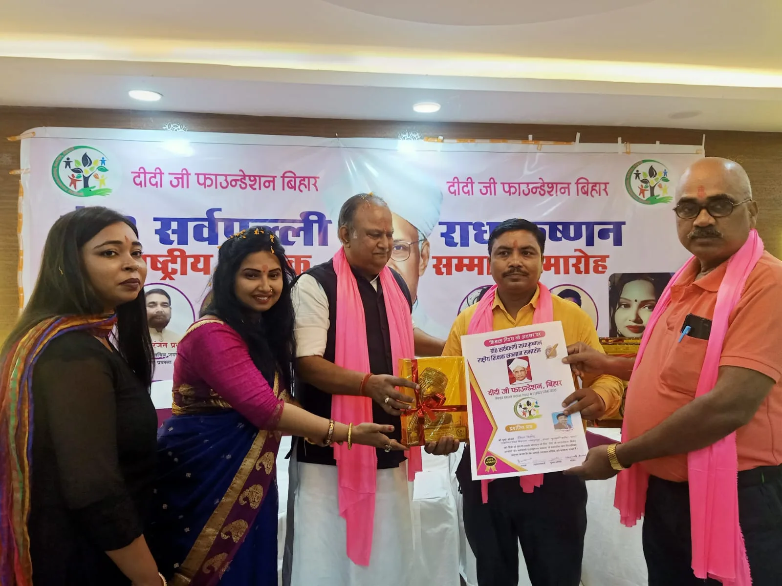 पटना : सामाजिक संगठन दीदीजी फाउंडेशन ने शिक्षक दिवस के अवसर पर शिक्षा के क्षेत्र उल्लेखनीय योगदान देने वाले 40 शिक्षकों को डा. सर्वपल्ली राधाकृष्णन राष्ट्रीय शिक्षक सम्मान से सम्मानित किया।