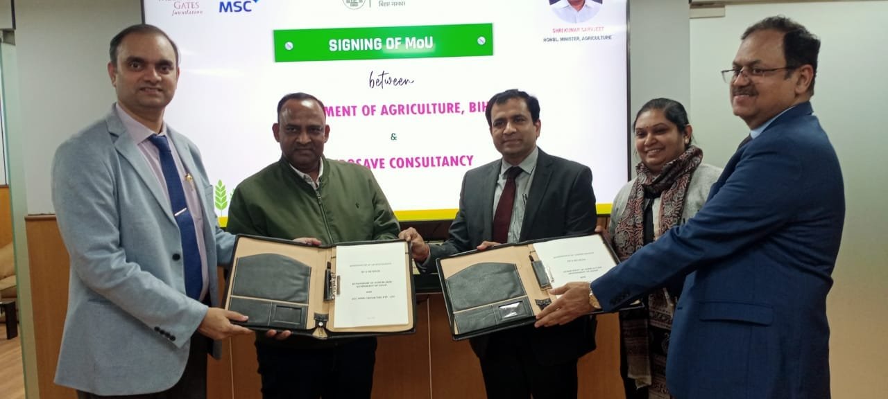 मंत्री कृषि विभाग, बिहार कुमार सर्वजीत एवं सचिव, कृषि विभाग संजय कुमार अग्रवाल की उपस्थिति में आज कृषि भवन, पटना में बिहार के किसानों के लिए एक एकीकृत डिजिटल प्लेटफॉर्म को विकसित करने के लिए कृषि विभाग एवं माइक्रोसेव कंसल्टेंसी के बीच समझौता ज्ञापन (एम॰ओ॰यू॰) किया गया। इस समझौता ज्ञापन (एम॰ओ॰यू॰) पर कृषि विभाग के तरफ से कृषि निदेशक डॉ॰ आलोक रंजन घोष तथा माइक्रोसेव कंसल्टेंसी के तरफ से प्रबंध निदेशक मनोज कुमार शर्मा ने हस्ताक्षर किया। बिल एवं मिलिंडा गेट्स फाउंडेशन की वरीय कार्यक्रम पदाधिकारी डॉ॰ श्रीवल्ली कृष्णन भी उपस्थित रहीं।
