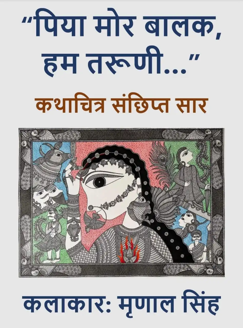 “पिया मोर बालक, हम तरुणी…”, उन गीतों में से है एक है जिसकी संगीत ने मेरे किशोर मानस पटल पर गहरा छाप छोड़ा था। स्व. शारदा सिन्हा जी के कंठ से वह सुरबद्ध गीत, मेरी आत्मसुख का मानो एक जरिया था। जैसे-जैसे मेरी मानस बुद्धि विकसित हुई, मेरी मानवीयता का भी विकास हुआ। जीवन की इस काल में जब मैं संवेदनाओं को समझ सकता हूँ, मुझे इस गीत के अर्थ को समझने के क्रम में मेरा ह्रदय करुणा से व्यथित हो उठा। इस गीत को चित्रांकन करने की प्रेरणा, मात्र संवेदना को चित्रण करना ही नहीं, अपितु इसे अनुभव भी करना था। मैंने इस चित्रकथा में, मैथिल कोकिल विद्यापति रचित इस गीत की युवती नायिका की अपने पति के स्नेह को न पाने की व्यथा और उसकी भावना को कागज़ पर चित्रांकित करने का प्रयास किया है।