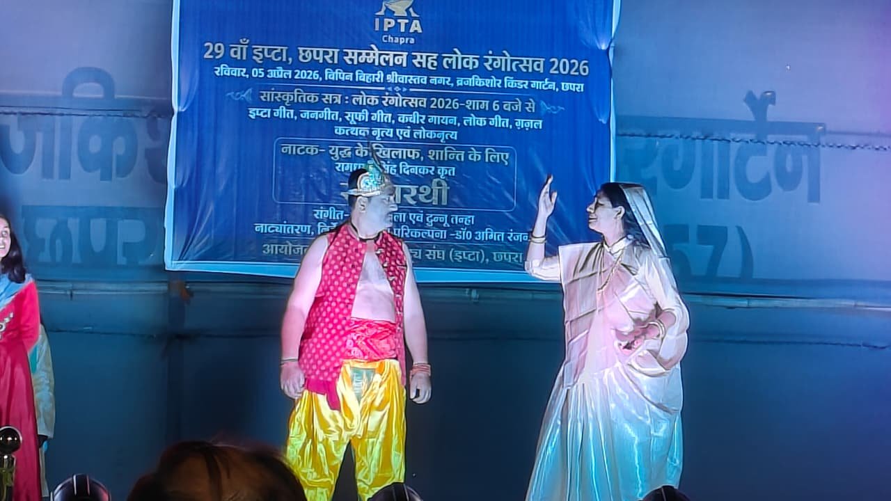 छपरा। भारतीय जनमानट्य संघ (इप्टा), छपरा द्वारा ब्रज किशोर किंडर गार्टन परिसर में रविवार को आयोजित इप्टा, छपरा के 29 सम्मेलन सह लोक रंग उत्सव 2026 का सांस्कृतिक सत्र कला और विचार की ऐसी संगति बनकर उभरा, जिसमें युद्ध-विरोध, शांति और मानवीय मूल्यों की स्पष्ट और प्रखर अभिव्यक्ति दिखाई दी। कार्यक्रम का केंद्रबिंदु रहा राष्ट्रकवि रामधारी सिंह दिनकर की कालजयी कृति ‘रश्मिरथी’ का नाट्य मंचन, जिसने समकालीन वैश्विक युद्ध-संकटों के बीच शांति के पक्ष में सशक्त हस्तक्षेप किया।