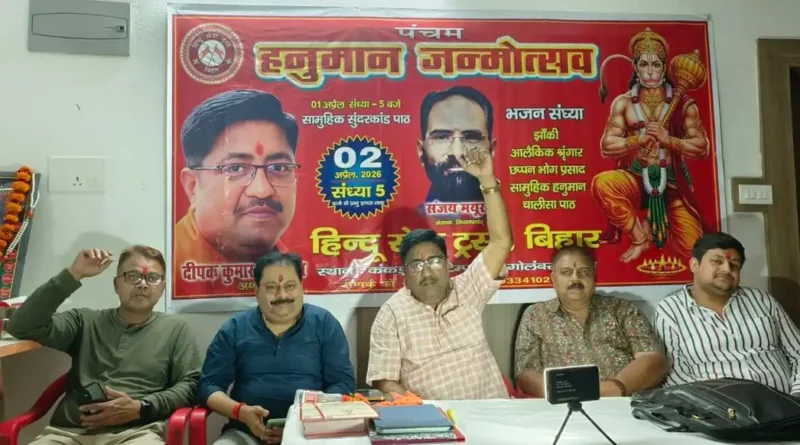 पटना : हिंदू सेवा ट्रस्ट बिहार के तत्वावधान में इस वर्ष राजधानी पटना में दो दिवसीय हनुमान जन्मोत्सव का भव्य आयोजन किया जाएगा। ट्रस्ट के अध्यक्ष एवं मुख्य संस्थापक श्री दीपक कुमार अग्रवाल ने आज यहां बताया कि कार्यक्रम के तहत एक अप्रैल को कंकड़बाग टेम्पो स्टैंड चौराहा पर एक हजार से अधिक हनुमान भक्तों द्वारा सुंदरकांड का सामूहिक पाठ किया जाएगा।